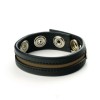Anneau pour pénis en cuir avec trois fermetures à pression, disponible en noir avec une bande jaune ou rouge.