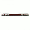 Anneau pour pénis en cuir avec trois fermetures à pression, disponible en noir avec une bande jaune ou rouge.