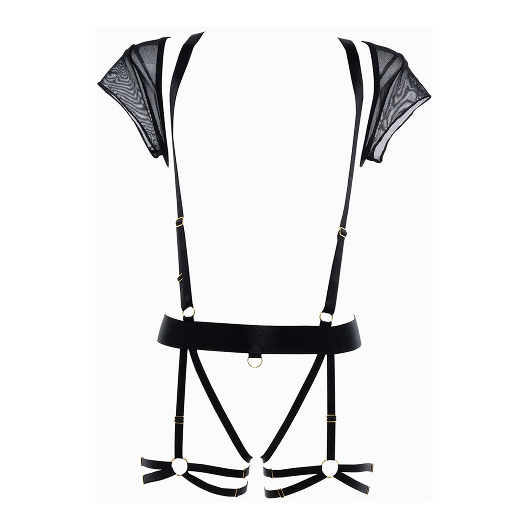 Pour le look de la fashionista et de la séductrice. Ce modèle n'est certainement pas destiné à Zoom, il ne peut être porté qu'en personne. Le haut boléro en maille avec bretelles réglables à l'avant et à l'arrière se fond dans une culotte entièrement ouverte avec bretelles réglables. Pour adoucir encore le look, des jarretelles soulignent les hanches avec des bandes de jambe réglables.