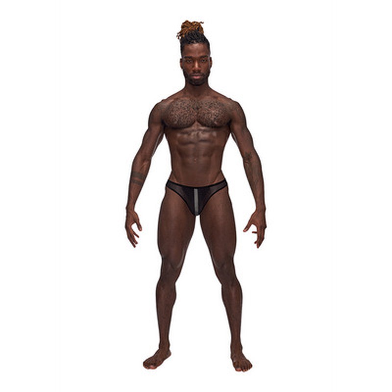 Issu de la collection Landing Strip de Male Power, ce slip de type bikini présente un fin élastique en peluche à la taille et aux jambes, une bande d'insertion en onyx mat ton sur ton sur le devant et à l'arrière, ainsi qu'une étiquette métallique décorative avec le logo de la marque sur la ceinture arrière.
