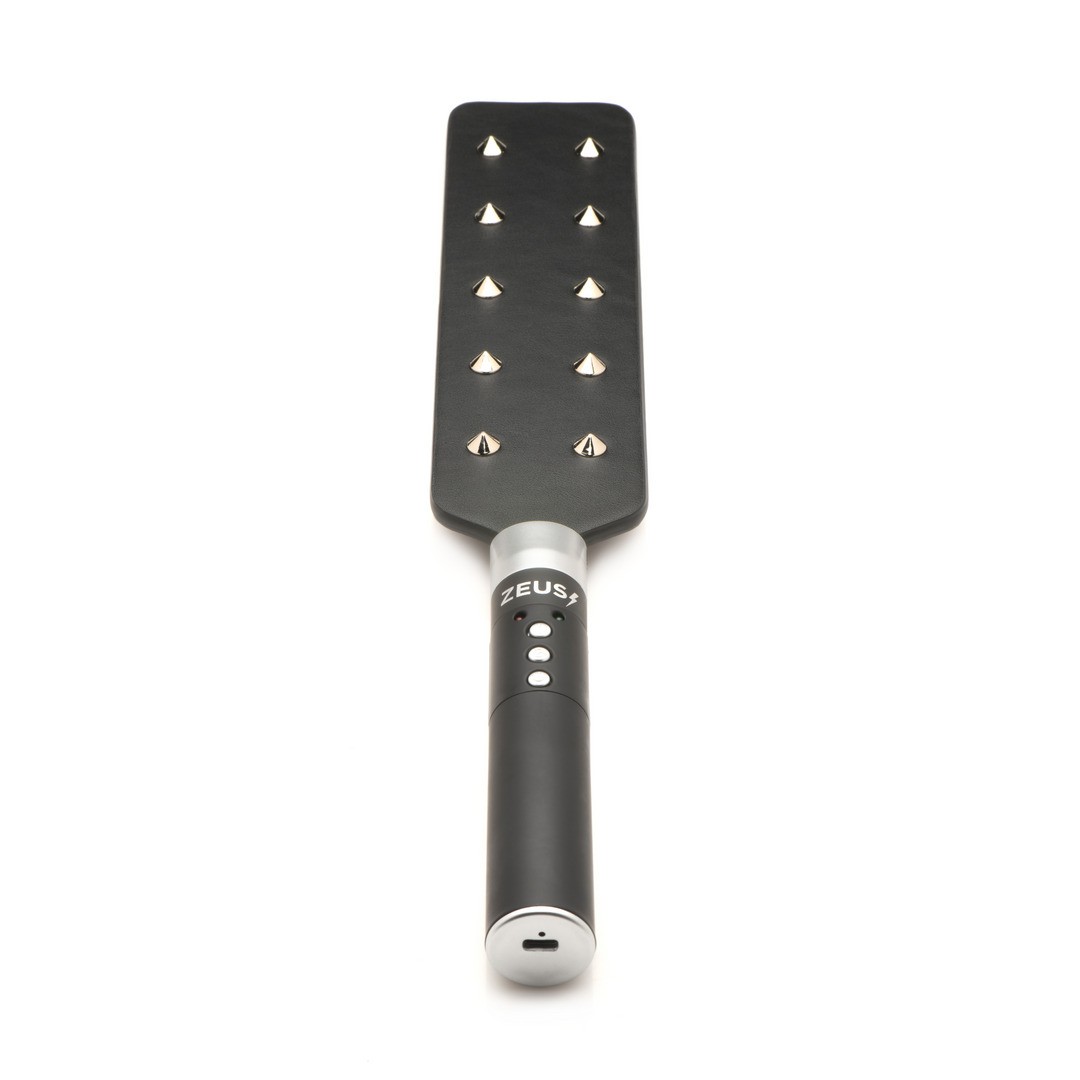 Paddle E-stim avec pointes conductrices pour des fessées électriquement stimulantes, avec deux niveaux d'intensité et un design vegan, rechargeable et sûr.