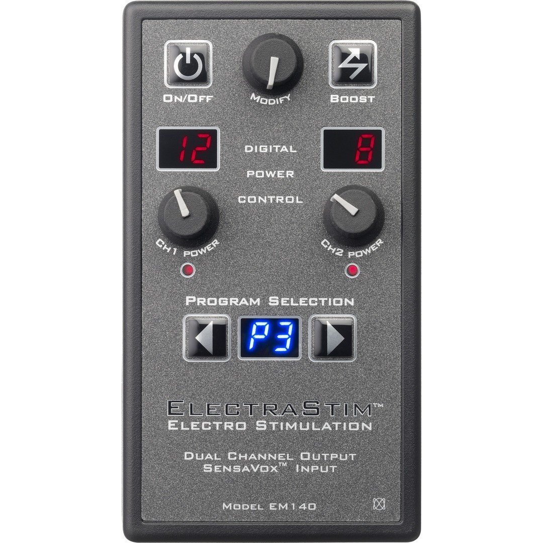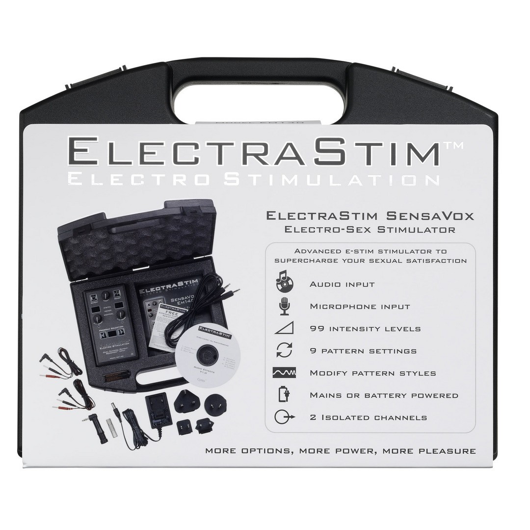 L'ElectraStim SensaVox est un puissant stimulateur e-stim qui peut être alimenté par le secteur ou par piles. Il offre une large gamme de fonctionnalités à explorer et permet une stimulation synchronisée avec le son, soit via le microphone inclus, soit via le câble d'entrée ligne.
