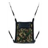 Balançoire en tissu camouflé avec tous les accessoires inclus: crochets avec mousquetons métalliques, repose-pieds rembourrés (11 cm de large) et coussin (23 x 38 cm). La housse est de forme rectangulaire.