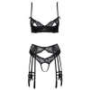 L'ensemble noir de Cottelli LINGERIE comprend un soutien-gorge à armatures, un porte-jarretelles, un string et des jarretelles élégantes. Il est confectionné en dentelle douce, délicate et élastique, tandis que les jarretelles sont faites de bandes élastiques souples.