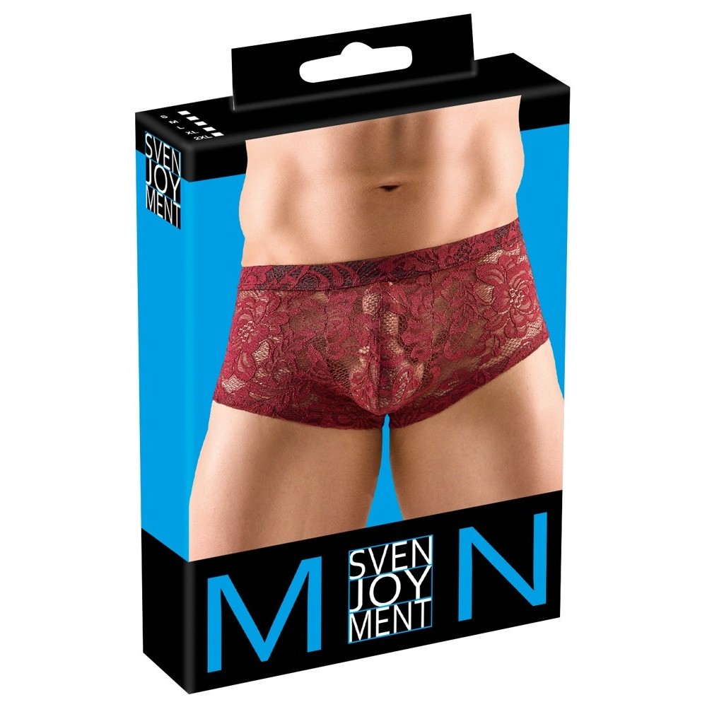 Les shorts moulants de Svenjoyment sont confectionnés en dentelle florale rouge foncé et possèdent une taille élastique recouverte de tissu. La matière est douce et élastique, garantissant un ajustement extrêmement confortable.