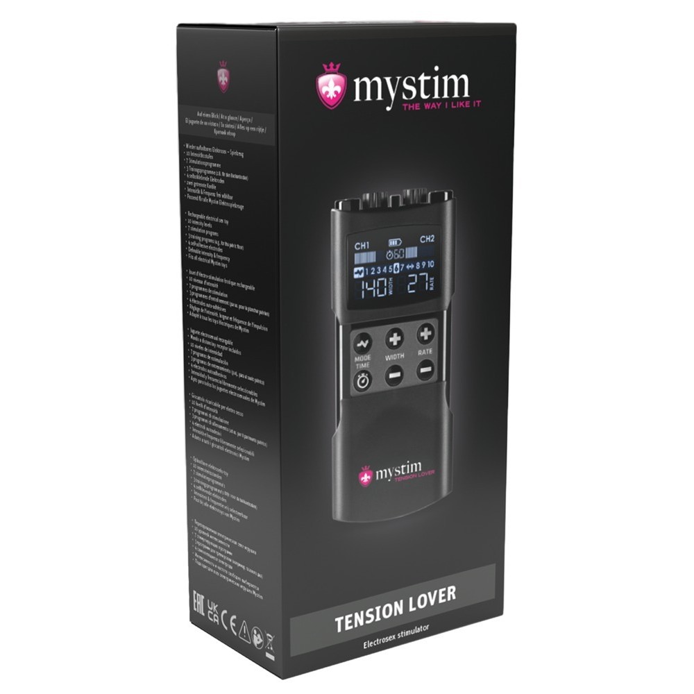 Le retour d'un classique : l'appareil de stimulation Tension Lover 2 de Mystim. Il offre tout le répertoire de l'e-stimulation, des doux picotements et chatouillements délicats aux pulsations rythmiques et aux poussées sensuelles.