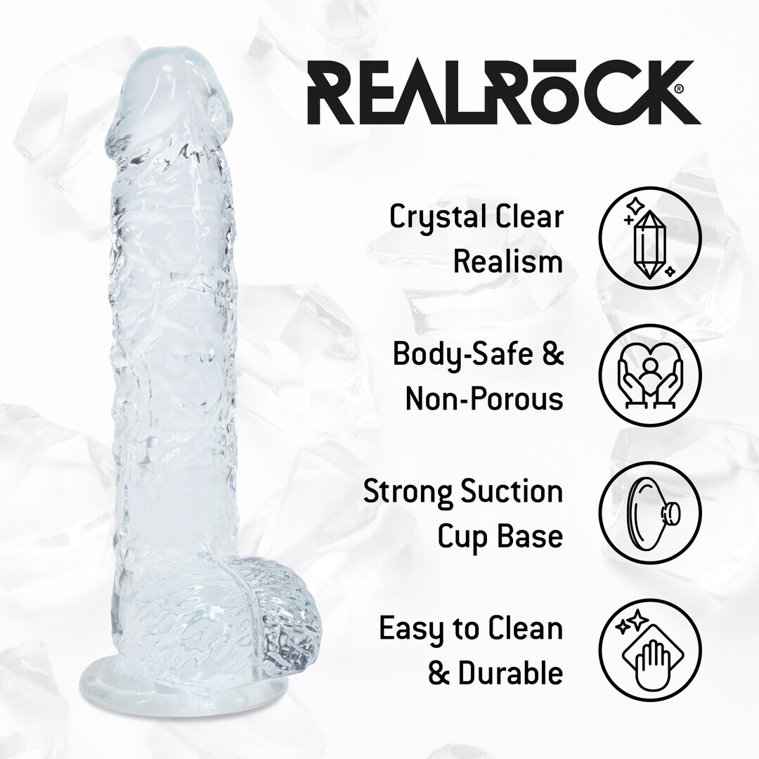 Le modèle REALROCK Crystal Clear a été conçu avec des testicules réalistes pour une expérience plus authentique. Il est équipé d'une ventouse résistante qui permet de le fixer facilement sur pratiquement n'importe quelle surface lisse. Fabriqué dans un matériau sans danger pour le corps et non poreux, il est facile à nettoyer et offre une plus grande durabilité.