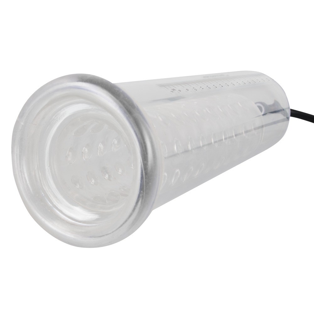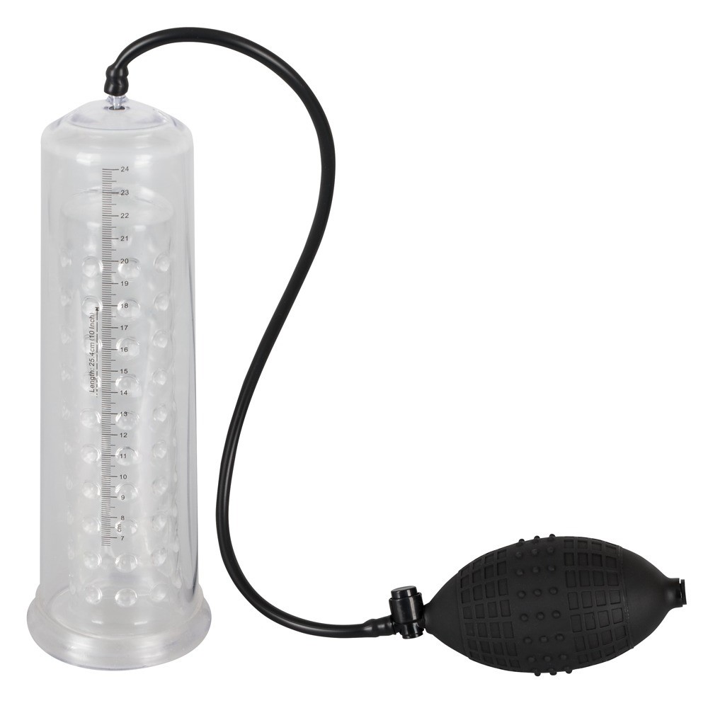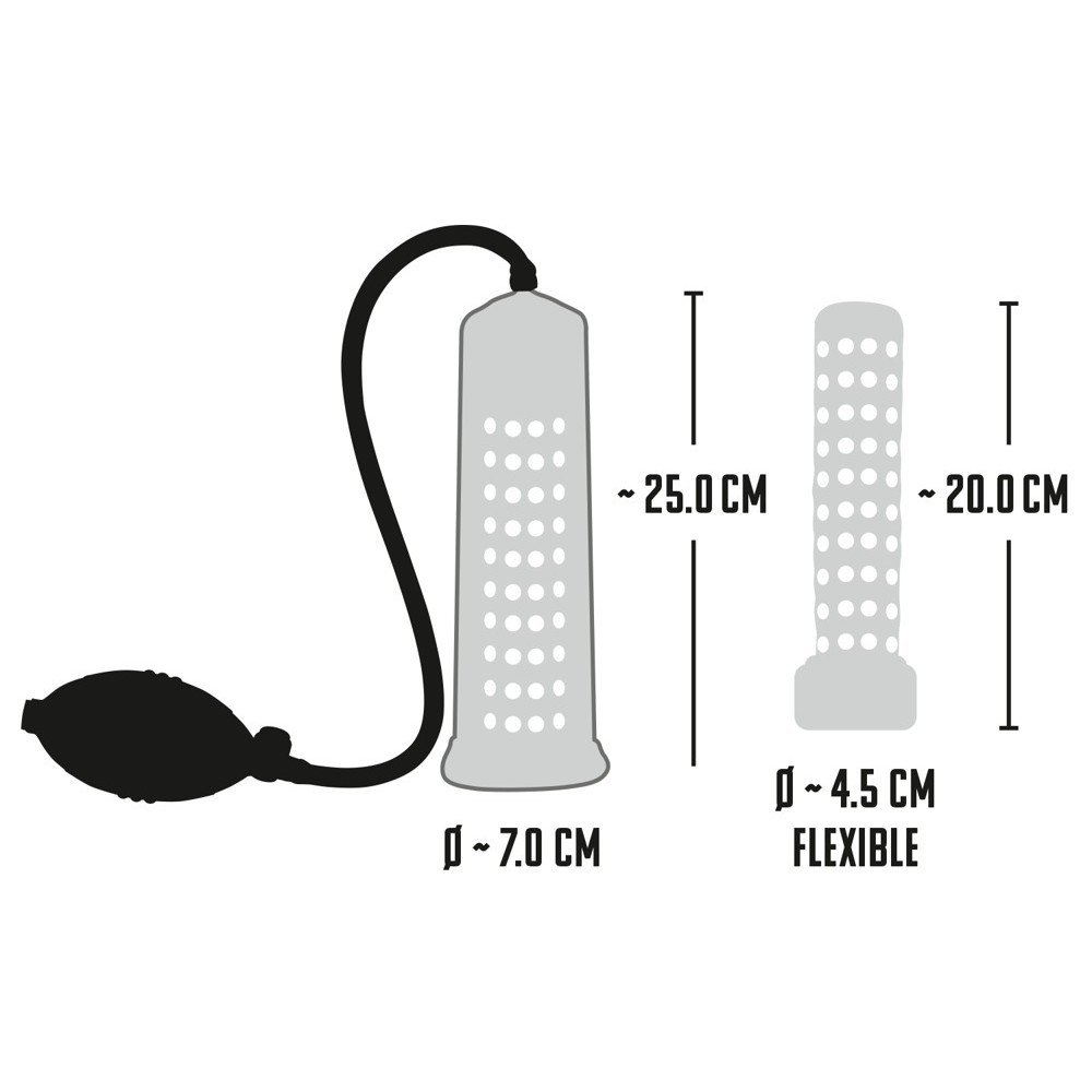 Pompa per pene trasparente con guaina interno a forma di bottone (diametro 4,5 cm, flessibile, lunghezza circa 20 cm) e pratica pompa a sfera. È possibile monitorare il successo dell'ingrandimento del pene tramite la scala graduata. Con valvola di sicurezza.