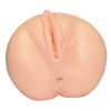 Masturbatore a forma di vagina e ano, color pelle, con stimolanti scanalature interne e fori elastici per il piacere.