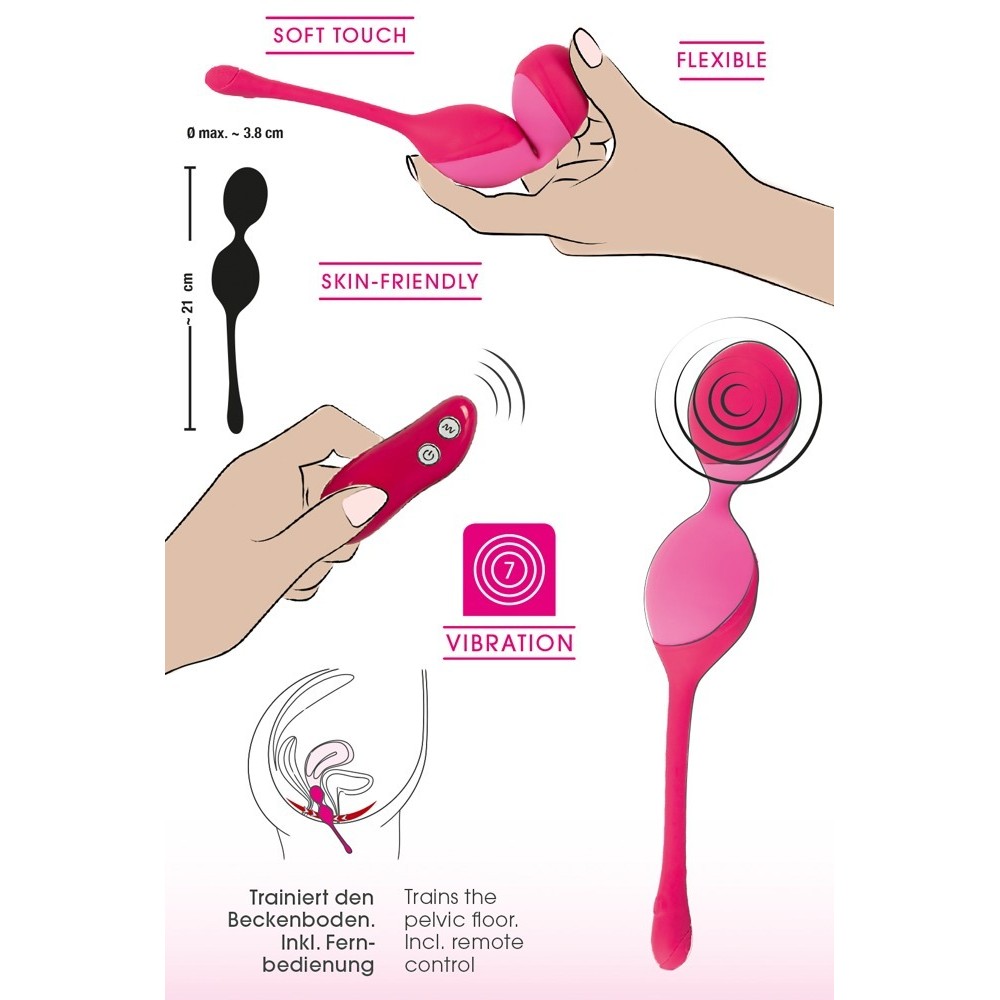 Doppia pallina vibrante ricaricabile, con cinturino elastico rimovibile e sette modalità di vibrazione. Il telecomando consente un controllo semplice, pratico e comodo delle diverse modalità di vibrazione. Le palline vibranti e il telecomando possono essere ricaricati contemporaneamente grazie ai due cavi USB inclusi.