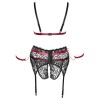 Reggiseno senza ferretto, reggicalze e tanga senza cavallo di Cottelli BONDAGE, in pizzo nero elasticizzato con dettagli stravaganti in materiale opaco rosso scuro. Il set include anche elementi decorativi in tonalità oro rosa e borchie audaci. Il reggiseno ha spalline leggermente più larghe e regolabili, nonché chiusura a gancio sul retro. Le clip per le braccia incluse possono essere fissate agli anelli laterali del reggicalze tramite ganci a pressione. Il reggicalze ha una chiusura a gancio sul retro e cinturini regolabili. Il perizoma, completamente aperto sul cavallo, dà il tocco finale a questo trio provocante.