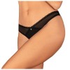 Perizoma Latinesa nero di Obsessive, in tulle trasparente ed elastico, morbido al tatto. Presenta rifiniture in pizzo e un piccolo elemento decorativo sulla parte anteriore della cintura. Design aperto nella zona del cavallo e impreziosito da ricami elaborati sul retro, creando un effetto seducente ed elegante.