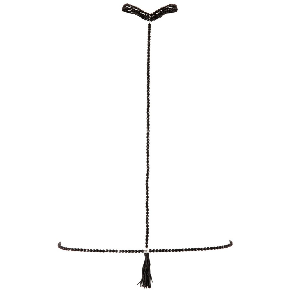 Tre file di perle elastiche che girano intorno al collo sono collegate alla catena del bikini da un'altra catena che può essere chiusa con un piccolo moschettone sul retro. Sul ventre è presente una piccola nappina.