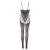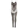 Catsuit nero con motivi in pizzo sulla zona del seno, intorno alle cosce e nell'area dell'inguine aperta, che creano un look provocante ed elegante. Senza cuciture per una vestibilità perfetta, con spalline elastiche e piedi integrati, garantendo comfort e un adattamento totale al corpo.