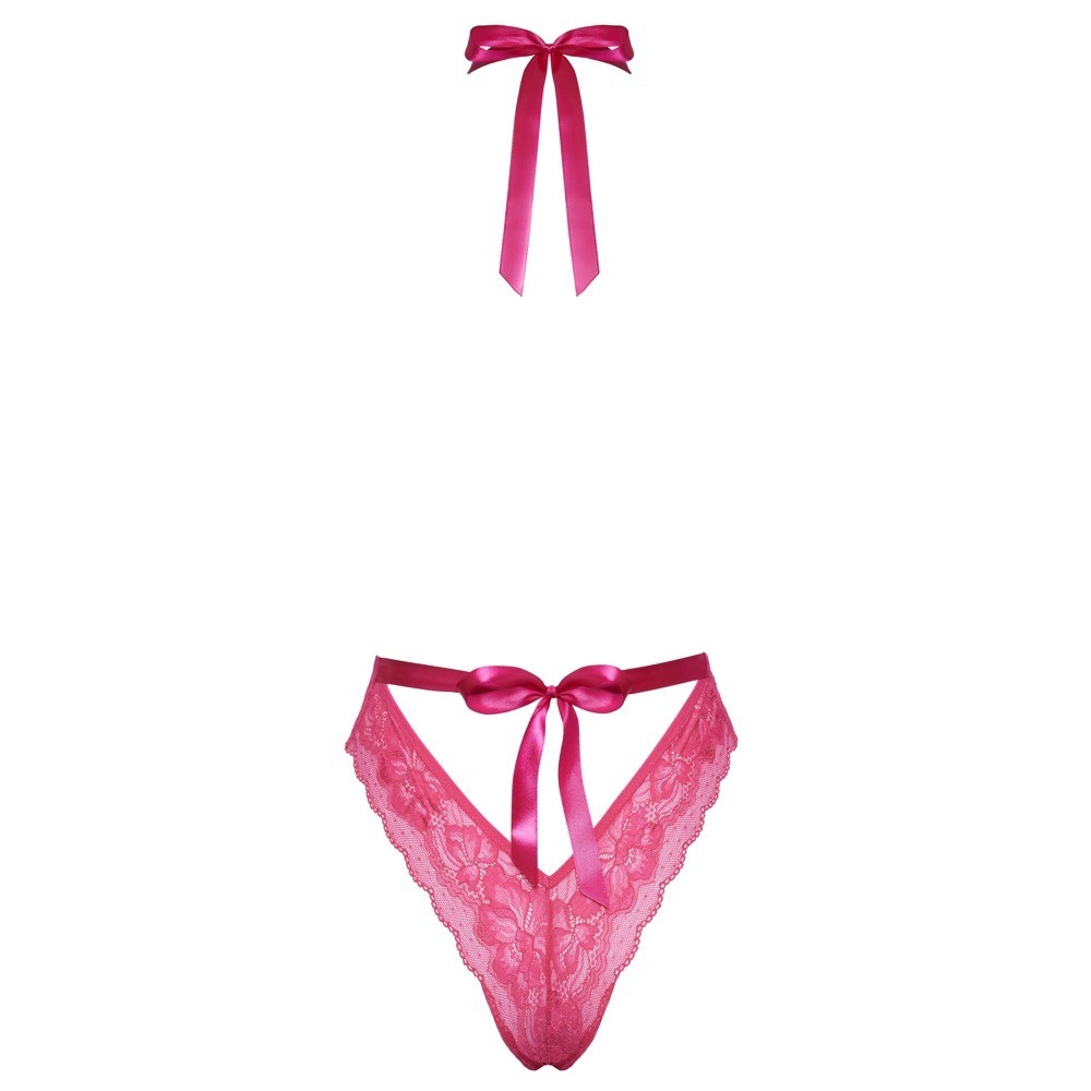 Body audace e seducente di Kissable, interamente in pizzo sottile rosa. Morbido ed elastico su tutto il corpo per il massimo comfort. Design provocante con un ampio scollo frontale che va dal collo alla vita. Senza schienale, con scollo all'americana e nastro in raso da annodare al collo, completato da un nastro in raso in vita, posizionato in un taglio a V sopra la zona inferiore.