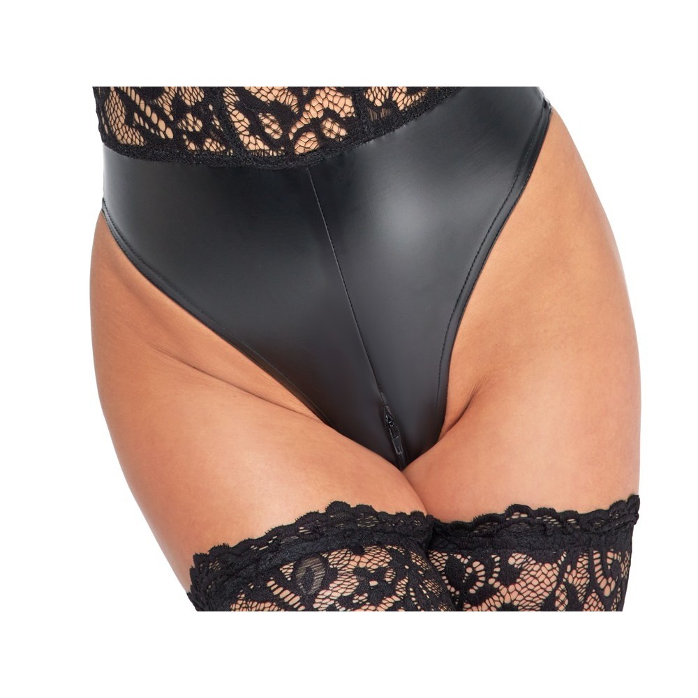 Body a maniche lunghe di Noir con top in morbido pizzo elasticizzato e slip in elegante powerwetlook. Scollatura profonda, con una pratica cerniera nella zona dell'inguine per una maggiore sensualità e facilità d'uso.