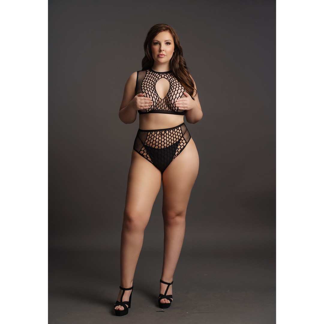 Set di due pezzi composto da top corto e perizoma a vita alta in rete da pesca e rete di recinzione con dettaglio a forma di goccia. Leggermente elastico, si adatta alle taglie dalla XL alla 4XL. Perizoma non incluso.