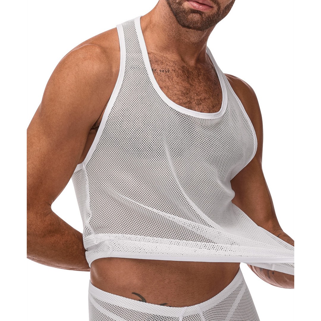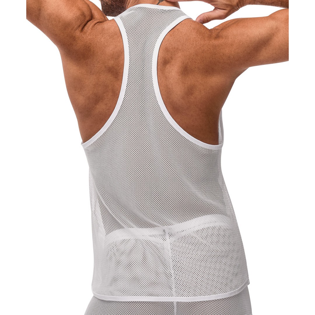 Canotta Tank maschile Male Power in rete elastica trasparente e traspirante, con taglio sulla schiena e design sensuale.