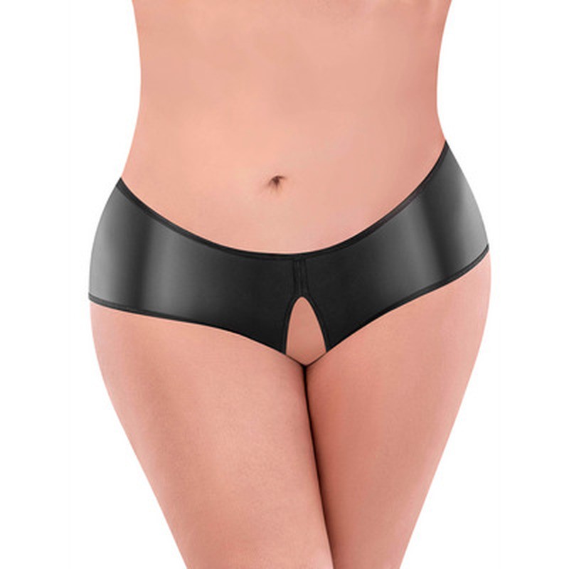 Tanga in tessuto nero effetto bagnato, con cavallo aperto e fiocco in raso, della collezione Panty by Magic Silk, sensuale ed elegante.