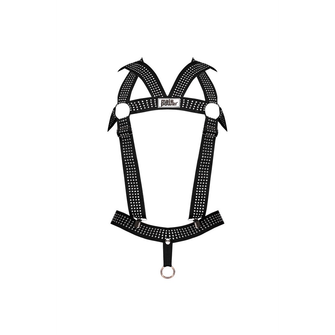 Imbracatura corporale maschile Male Power con fasce elastiche, anello fallico in silicone e dettagli metallici regolabili.