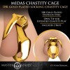 Gabbia di castità in acciaio inossidabile placcato oro 18 carati, con estremità aperta e due anelli di regolazione.