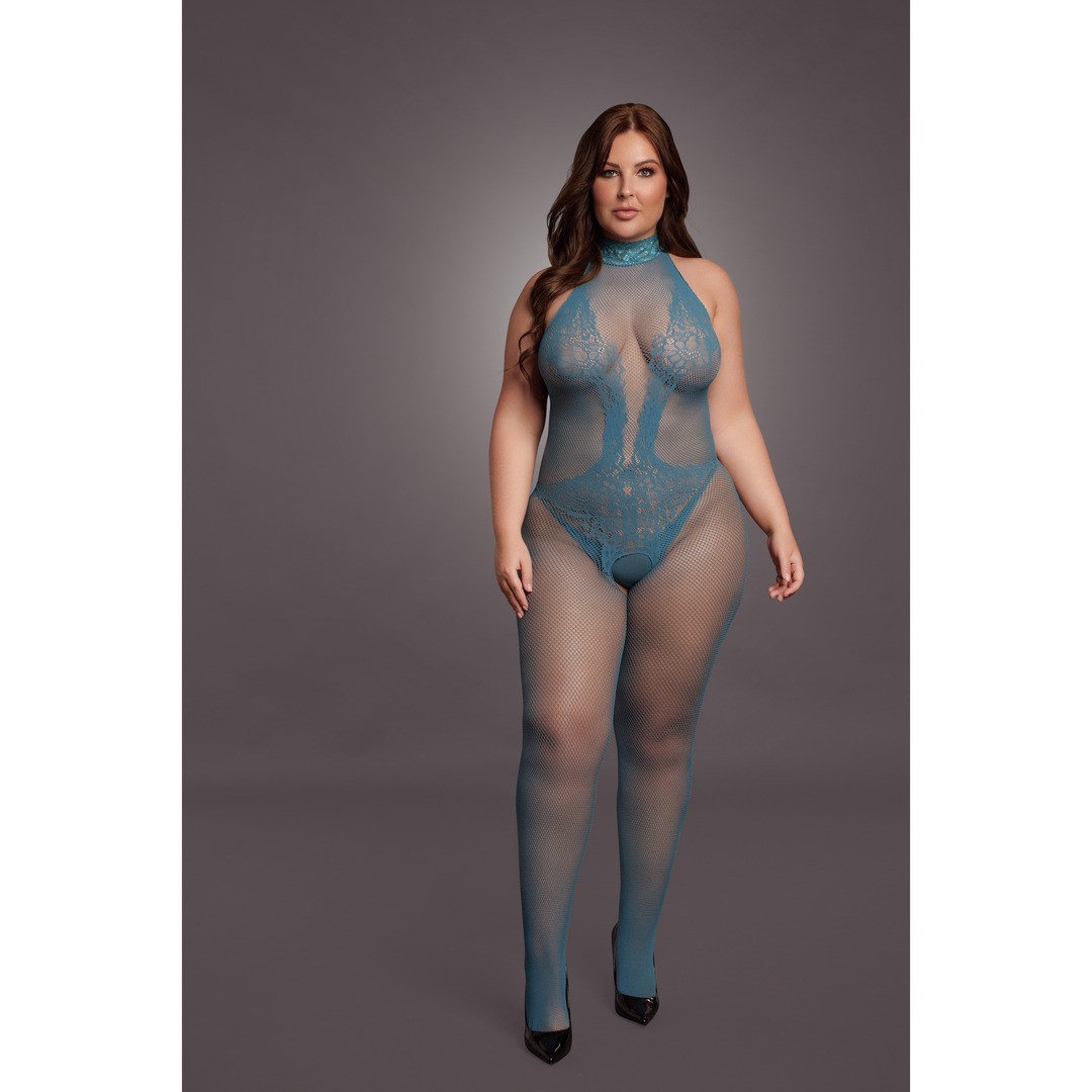 Catsuit Le Désir in pizzo e rete con scollo all'americana e apertura sul cavallo, dalla XL alla 4XL.