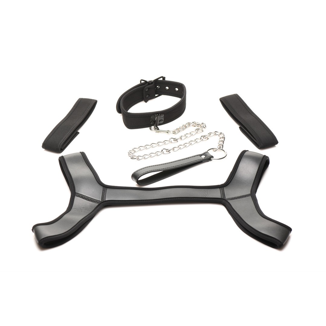 Kit completo di costume “Pup Play” con cappuccio, imbracatura, collare e guinzaglio in neoprene resistente, perfetto per esplorare il tuo lato canino con comfort e divertimento.