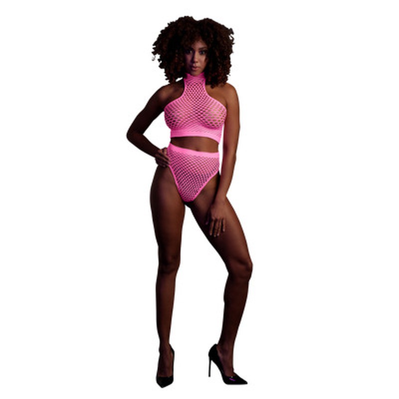 Libera la dea che è in te con i materiali attivati dai raggi UV, che fanno brillare questo completo al buio, assicurandoti di distinguerti con un seducente tocco di mistero. Scegli tra rosa neon o verde neon per un look vivace e pieno di personalità.