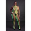 Catsuit Neon UV con scollo halterneck e cavallo aperto, in rosa o verde neon, per un look audace che illumina la notte.