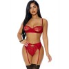 Set tre pezzi in delicato pizzo tagliato, composto da un sofisticato reggiseno con coppe con ferretto e sensuali tagli sottili. Il reggicalze aggiunge un tocco di eleganza e audacia, sottolineando la silhouette femminile.