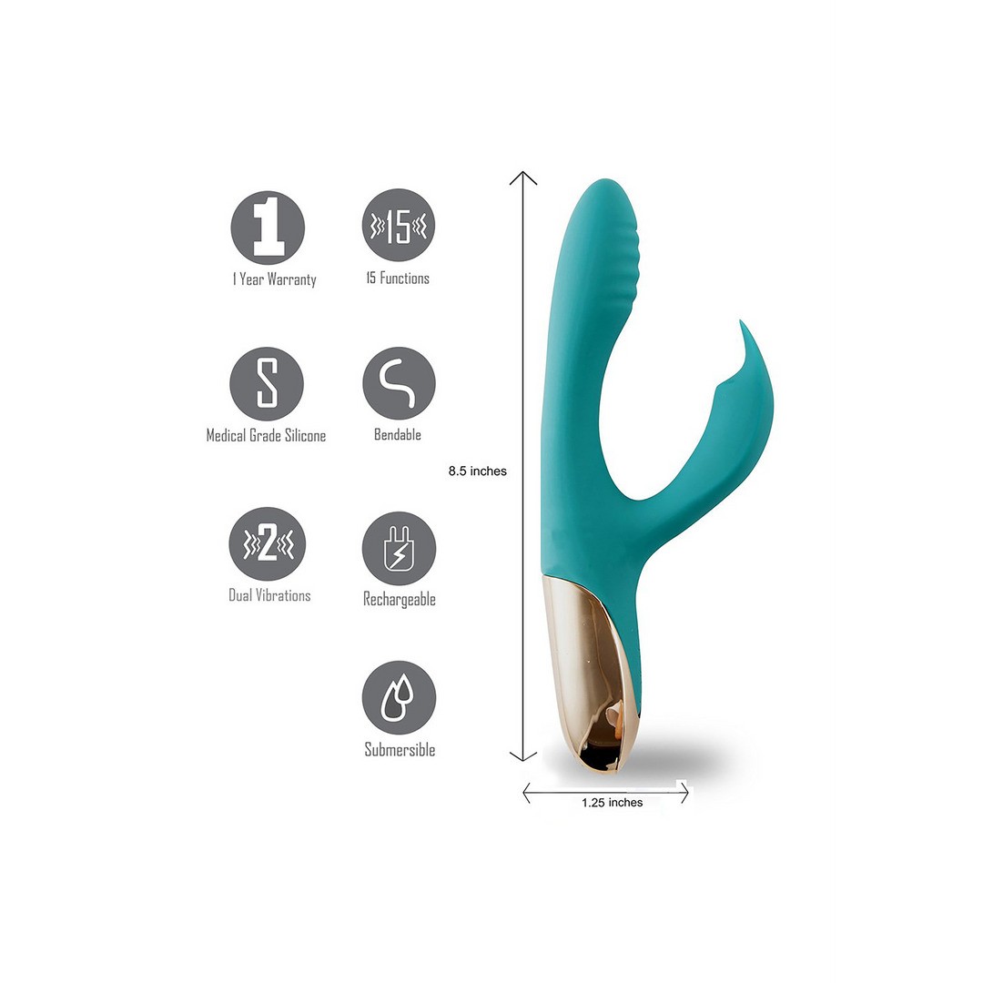 Questo vibratore ha due motori indipendenti, ciascuno con 15 funzioni di vibrazione e intensità progressiva. È completamente ricaricabile e rivestito in silicone 100% body-safe. Per il divertimento in acqua, Skyler è completamente sommergibile.