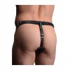 Imbracatura con anello per pene in metallo e plug anale rimovibile con ventosa, che offre doppio piacere e controllo assoluto.