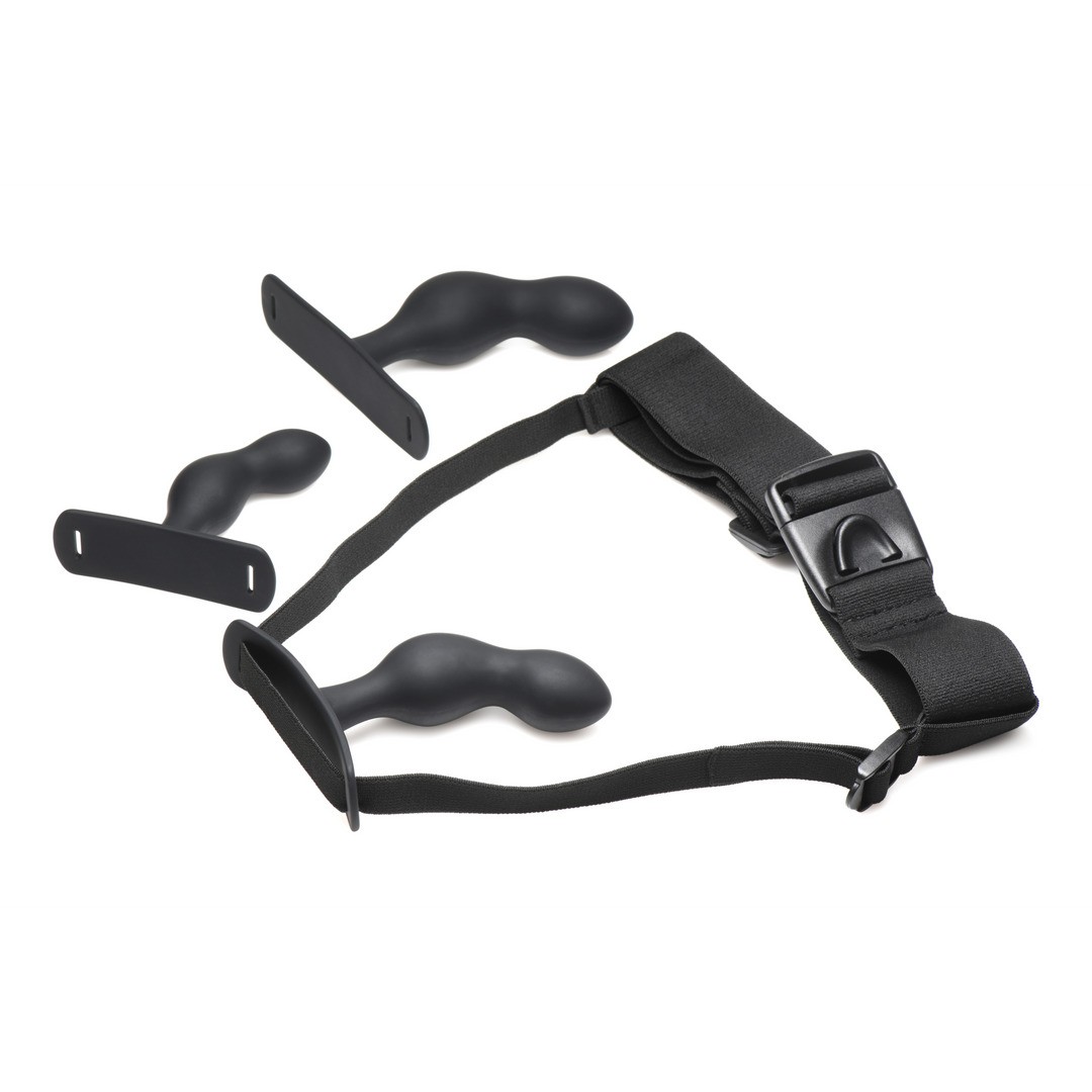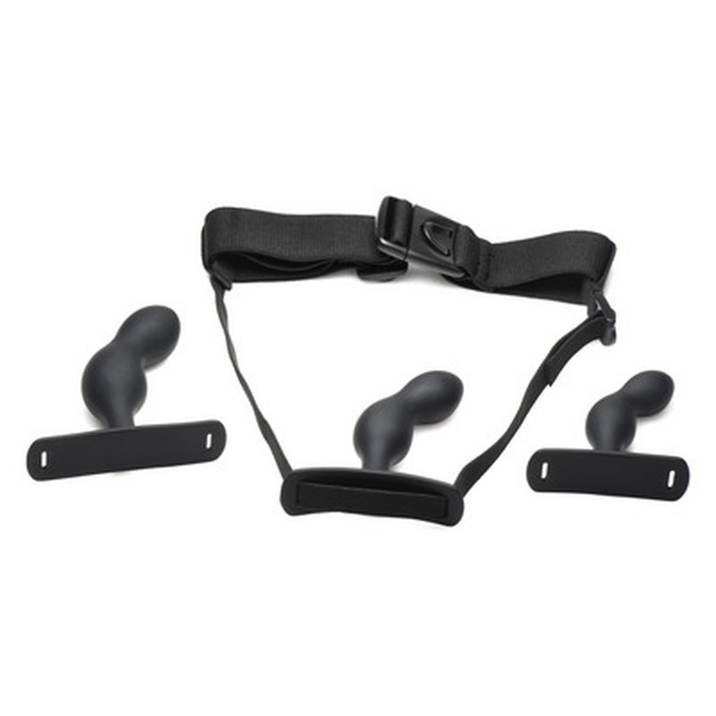 Set per allenamento anale con tre plug e imbracatura regolabile, ideale per stimolare la prostata e passare gradualmente a misure più grandi con comfort e piacere.