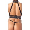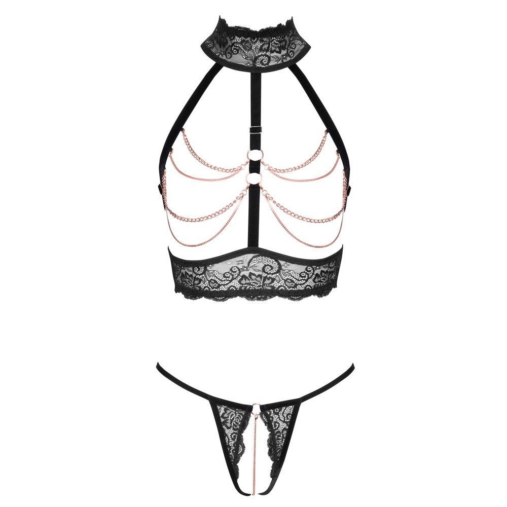 Seducente completo senza cavallo di Abierta Fina, composto da top con coppe aperte e perizoma abbinato. Il pizzo nero, morbido ed elastico, si abbina alle spalline in velluto e alle catene in tonalità oro rosa, creando un look sofisticato e provocante.