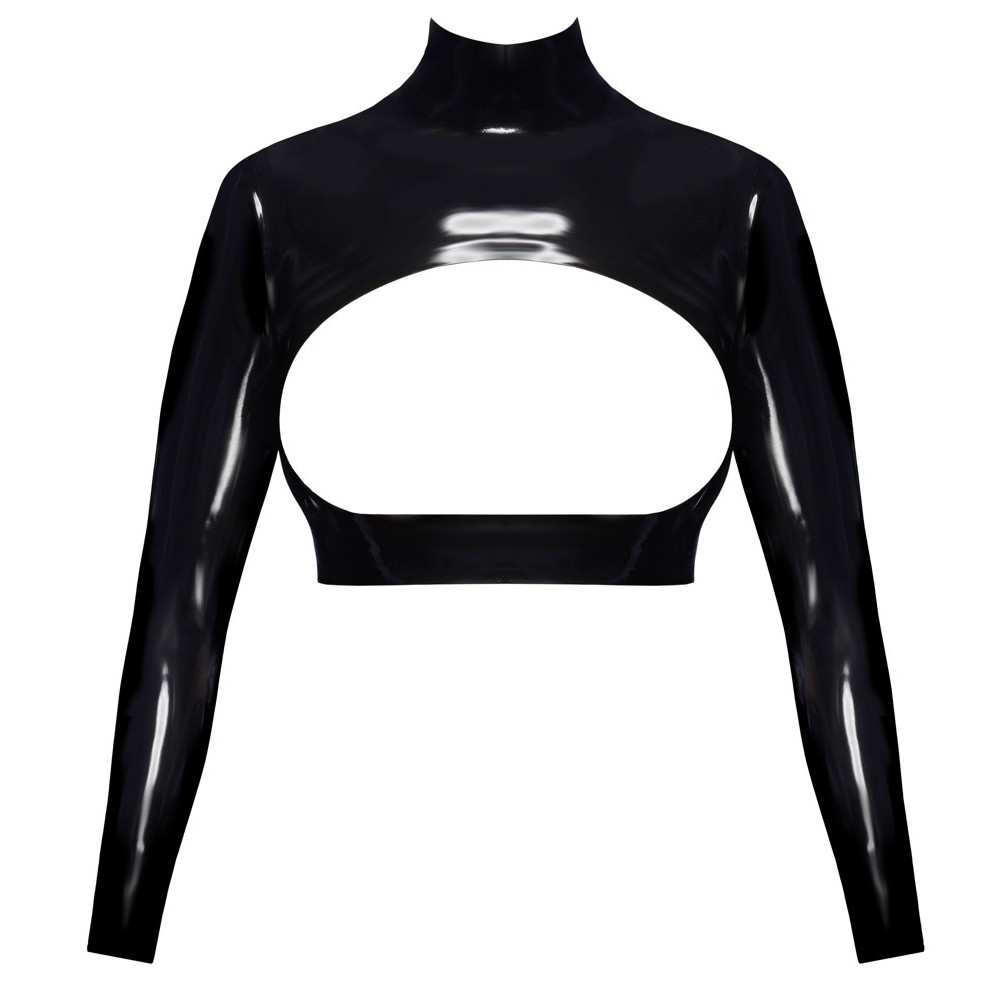 Il crop top di LateX è realizzato in lattice naturale nero (spessore 0,35 mm) e presenta anche un ampio cut-out sul davanti per mostrare il seno in modo mozzafiato. Il top è elegante e ha un collo alto e maniche lunghe. La cerniera posteriore a tutta lunghezza lo rende facile da indossare e da togliere.