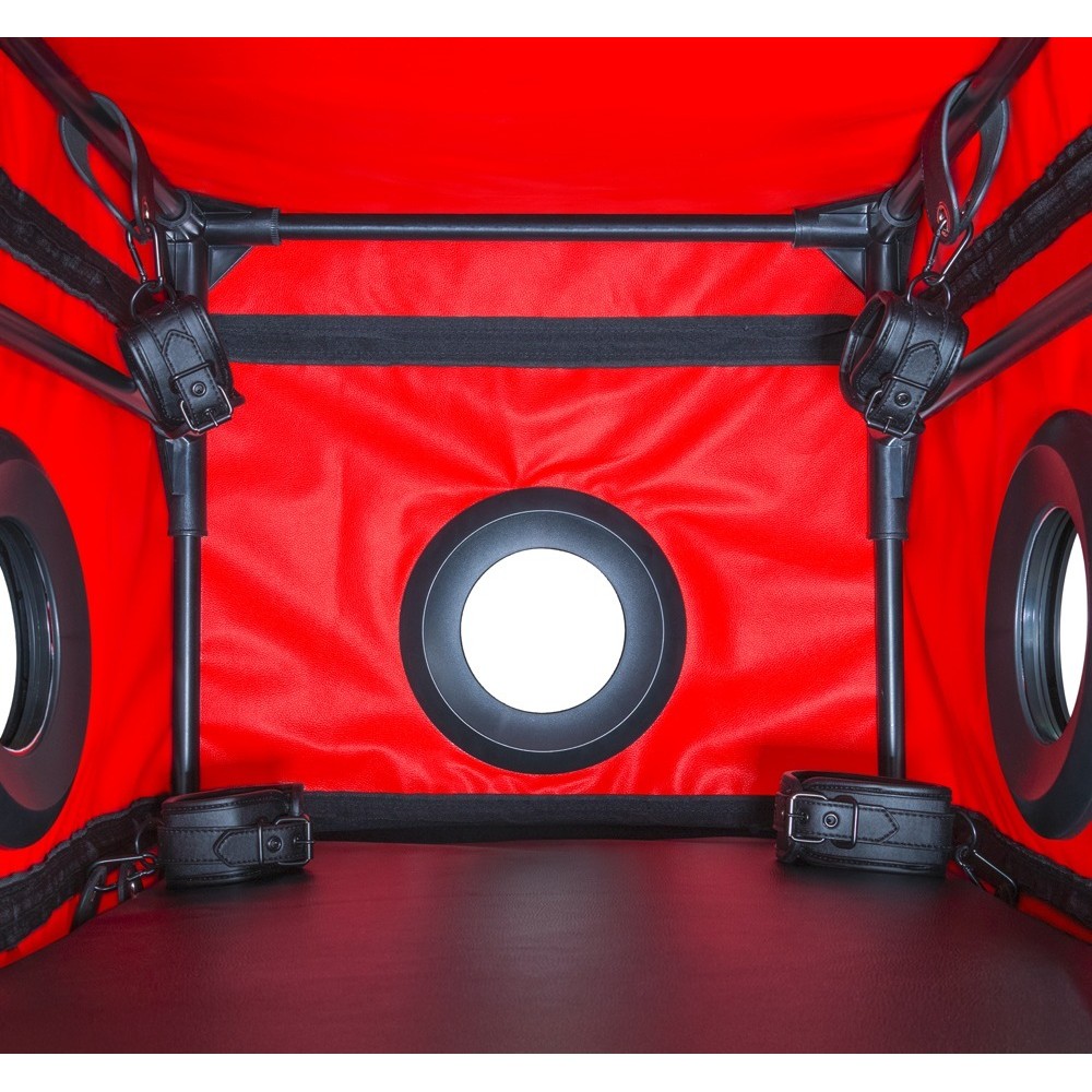 La scatola BDSM chiusa, La Niche di Secret Dome, è perfetta per il divertimento nel glory hole, per giochi oscuri, per accattivanti giochi di ruolo e per altre fantasie. La robusta scatola, con il suo sistema di innesto a tubo e il robusto coperchio, può essere assemblata rapidamente e sarà pronta all'uso in pochissimo tempo. Con 3 grandi fori ai lati. Il foro per la testa è dotato di una cerniera e di un ampio collare regolabile. Inoltre, offre un comodo accesso attraverso la porta con cerniera. La luce a LED e il morbido tappetino garantiscono un grande comfort. Le manette e le cavigliere incluse (1 set di ciascuna) possono essere posizionate all'interno a seconda delle necessità. Le morbide manette imbottite possono essere indossate e regolate rapidamente grazie alle fibbie di chiusura.