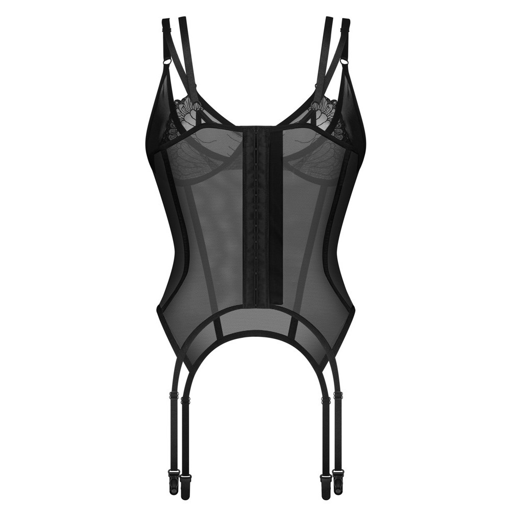 La baschina nera trasparente Arrowel di Obsessive ha uno stile aderente. Le coppe morbide e con doppio ferretto sono ricoperte da un delicato pizzo. È morbido ed elastico. Le doppie spalline e la chiusura a gancio sul retro sono regolabili. Anche le bretelle sono regolabili.