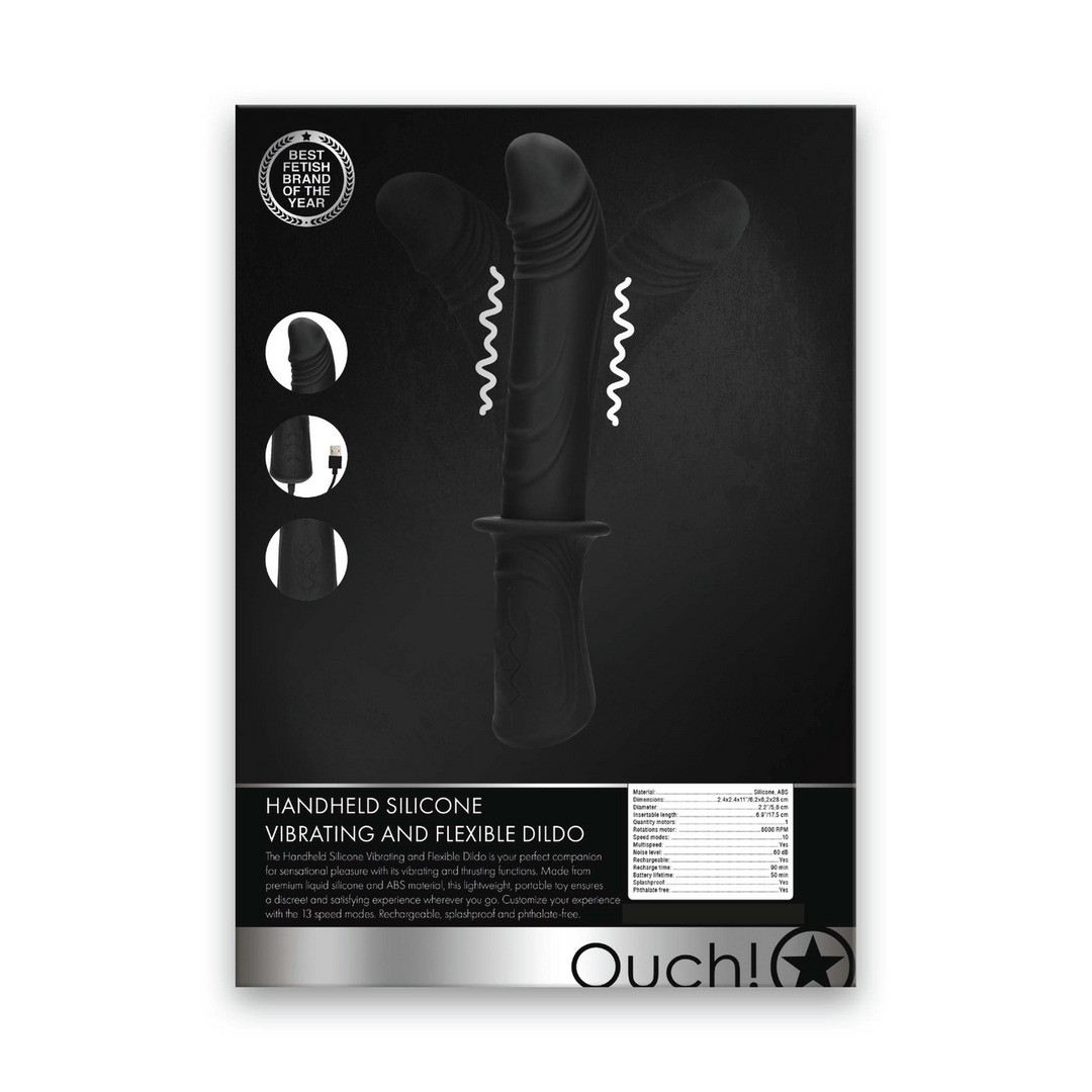 Infografica Dildo vibrante e flessibile in silicone Handheld (OU950BLK) in inglese.