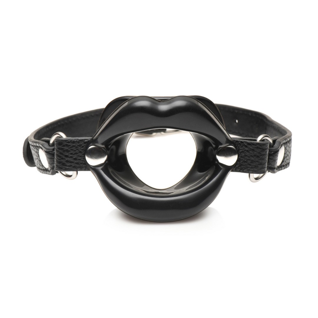 Bavaglio a bocca aperta con labbra grandi, cinturino regolabile e design ipoallergenico in pelle vegana per giochi intensi.
