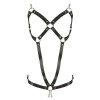 Tiras de couro combinadas com anéis de aço, tiras de sutiã de metal e duas correntes de metal que passam por cima da área das virilhas, que é aberta. Todas as tiras são ajustáveis para um ajuste perfeito.