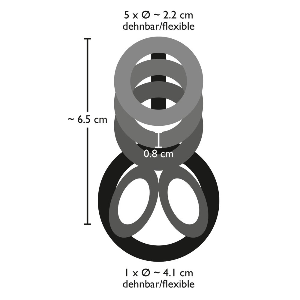 Anel para o pénis e testículos em cor fumada, composto por seis anéis ligados entre si por uma tira nodosa. Inclui um anel para o escroto, dois anéis para os testículos e três anéis para o pénis, garantindo suporte firme e confortável.