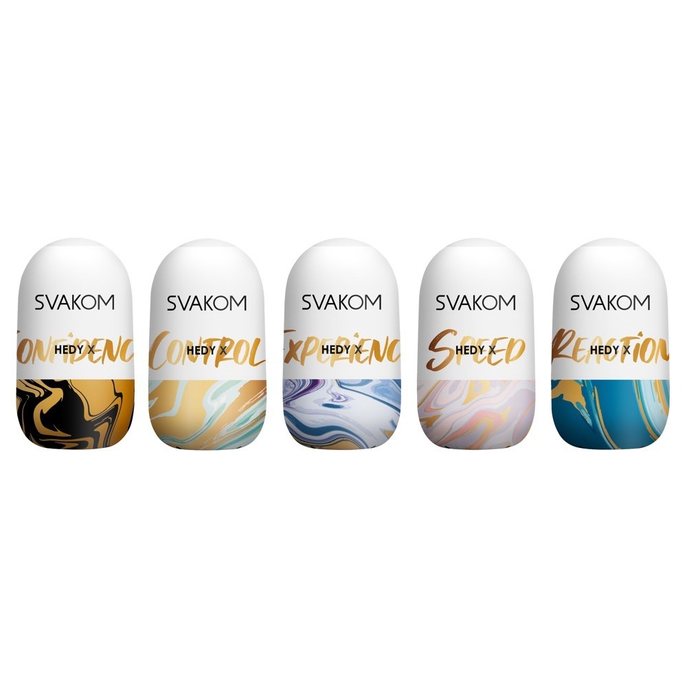 Conjunto de 5 masturbadores amovíveis Hedy X Mixed da SVAKOM, cada um alojado numa prática capa em forma de ovo. A capa funciona como distribuidor de lubrificante, suporte de secagem e espaço de armazenamento sem pó. Cada manga de masturbação é muito flexível e aveludada, adaptando-se a qualquer pénis e podendo ser usada 5 a 10 vezes. O interior possui textura pronunciada e estimulante, ideal para massagens intensas e orgasmos durante a punheta.