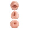 Este conjunto inclui três masturbadores com diferentes aberturas de prazer. É possível escolher livremente entre uma réplica realista de boca, vagina ou ânus, conforme o que for mais apetecível em cada momento. Os três masturbadores são suaves e extremamente macios ao toque, oferecendo um túnel de prazer aberto em ambas as extremidades.