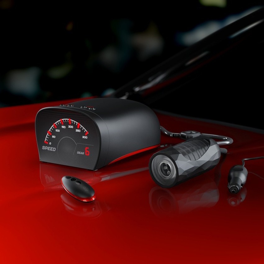 Inclui controlo remoto, adaptador para carro, filtro preto, adaptador AC 230V com ficha europeia, saída 12V e porta USB 5V.