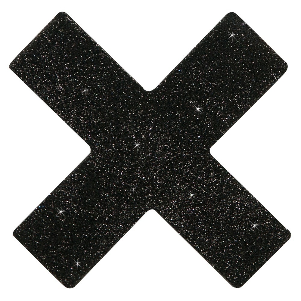 Adesivos para mamilos em forma de cruz, pretos e brilhantes, com tiras adesivas na parte traseira para uma fixação segura.