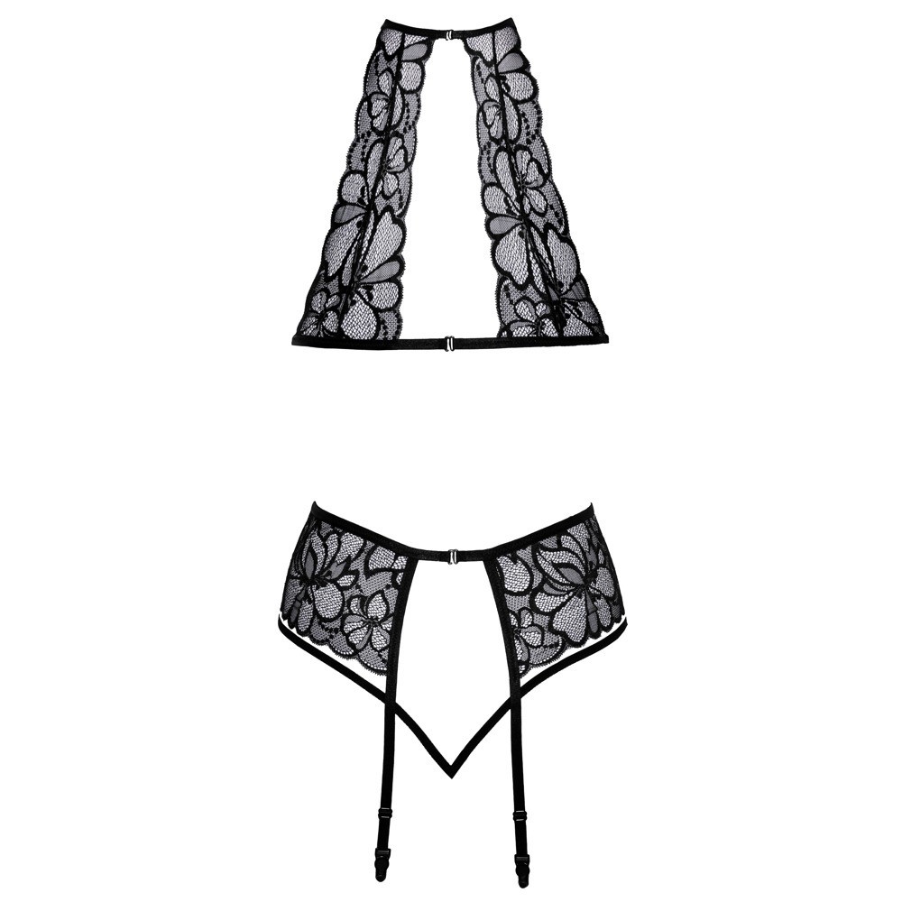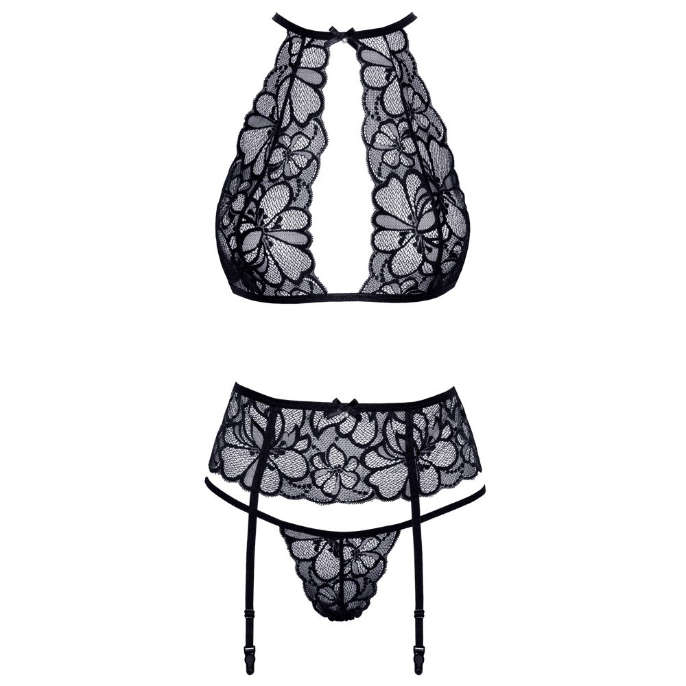 Conjunto da Kissable composto por sutiã sem aro, cinto de ligas e tanga, inteiramente confecionado em renda floral fina. Todas as peças são macias e elásticas, garantindo um ajuste confortável. O sutiã elegante possui fecho de gancho nas costas e também na parte de trás do pescoço. O cinto de ligas apresenta fecho de gancho na parte de trás e tiras de ligas ajustáveis. A tanga sedutora destaca-se pelas duas tiras finas e elásticas que se unem na zona frontal.