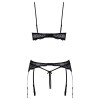 Conjunto da Cottelli LINGERIE composto por sutiã de prateleira, cinto de ligas e tanga sem virilha. Todas as peças são confecionadas em renda preta fina, macia e elástica, com o sutiã e o cinto de ligas decorados com anéis brilhantes.