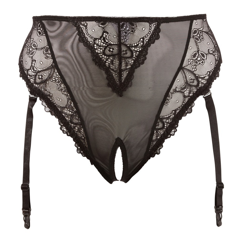 Cuecas com ligas e sem virilha, confeccionadas em powernet com renda floral delicada. O corte de cintura subida valoriza o estômago e a cintura, realçando as curvas. As tiras de ligas são ajustáveis e também podem ser completamente removidas.