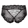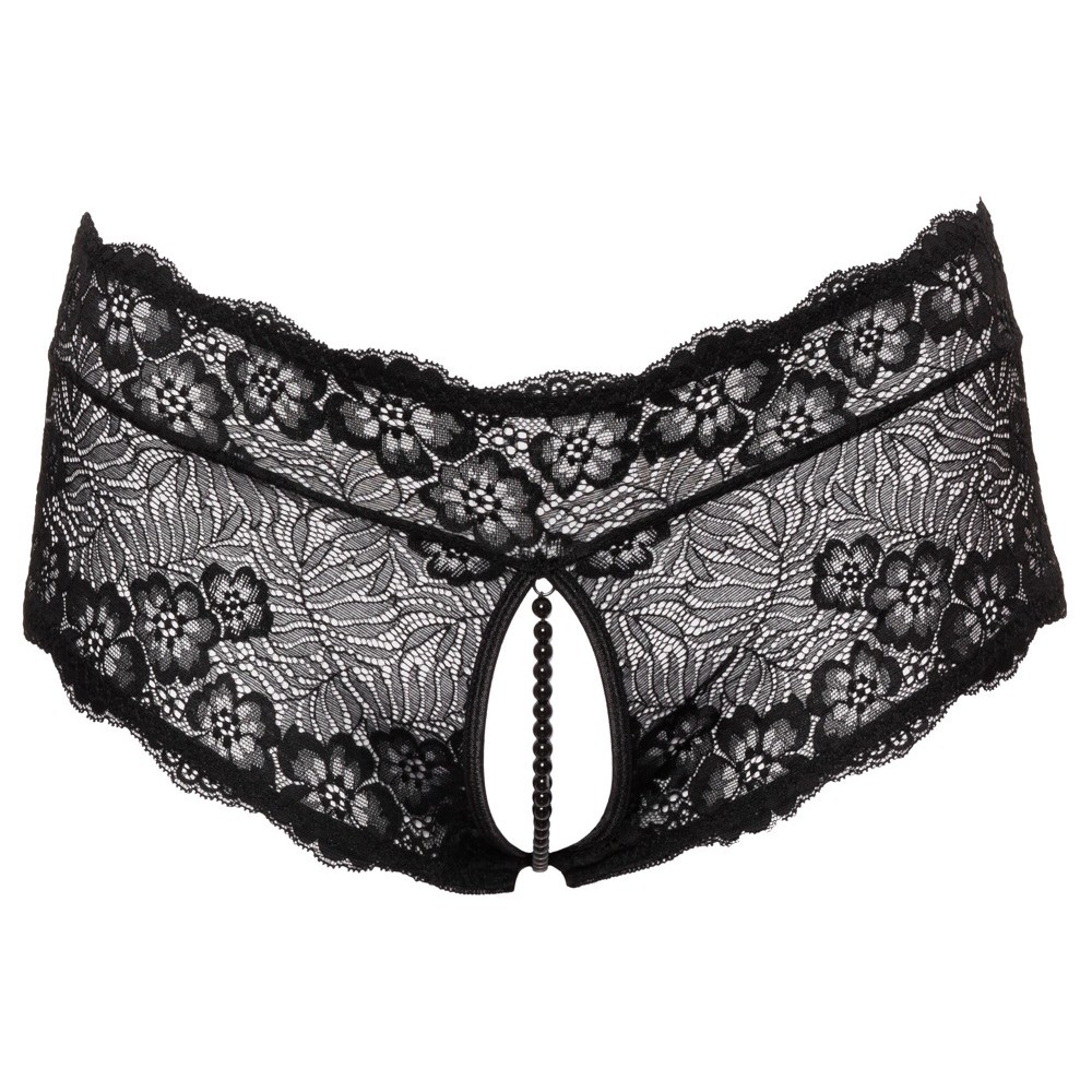 Cueca preta sem entrepernas da Cottelli CURVES, inteiramente em renda floral delicada. Suaves e elásticas para um ajuste perfeito e elevado conforto. A corrente elástica de pérolas na virilha aberta é estimulante e engenhosa, complementada por um laço de cetim no recorte triangular inferior.