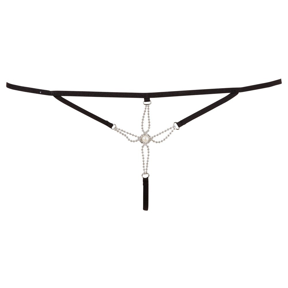 Tanga excitante em design de tiras, decorado com delicadas pérolas sobre a virilha aberta, criando um visual ousado e sedutor.